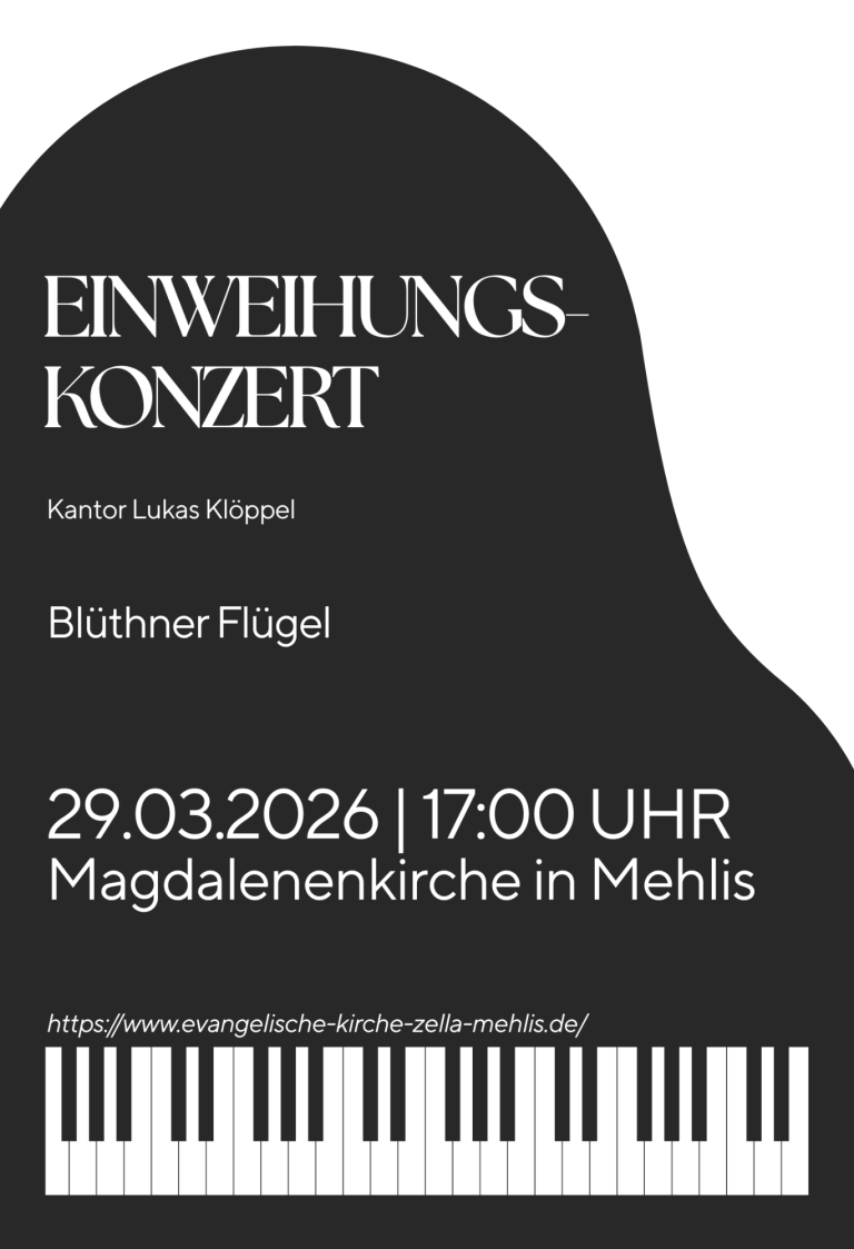 Wir laden Sie herzlich ein zum Einweihungskonzert am 29.03.2026, bei dem wir unseren neuen Blüthner Flügel feierlich präsentieren möchten. Das Konzert findet um 17:00 Uhr in der Magdalenenkirche in Mehlis statt. Lassen Sie sich von der Schönheit und dem Klang des neuen Instruments verzaubern und genießen Sie einen unvergesslichen Abend voller Musik und Gemeinschaft. Wir freuen uns auf Ihr Kommen!